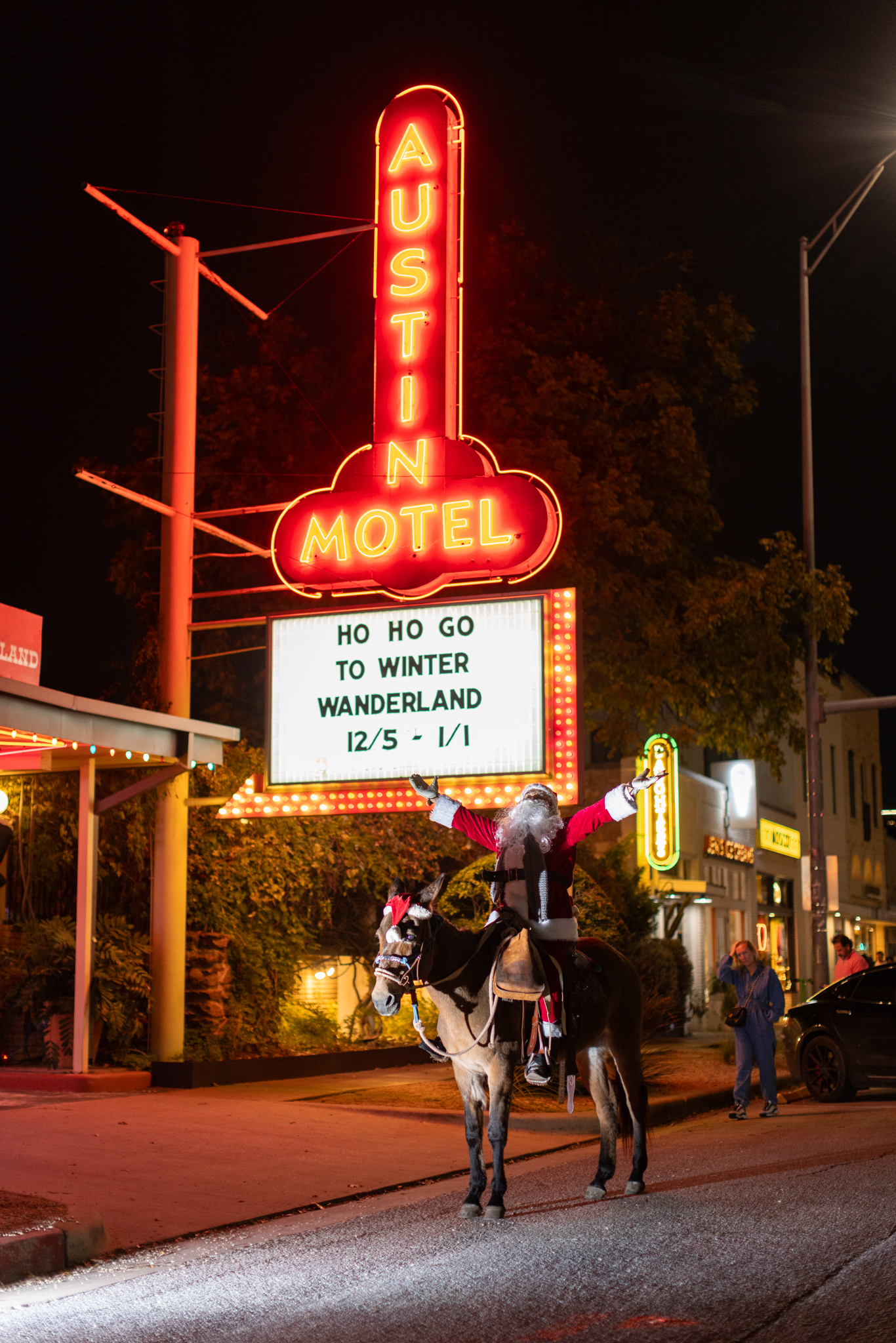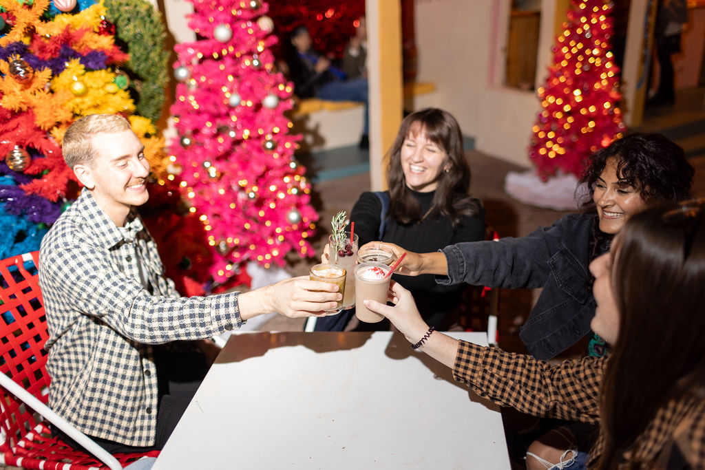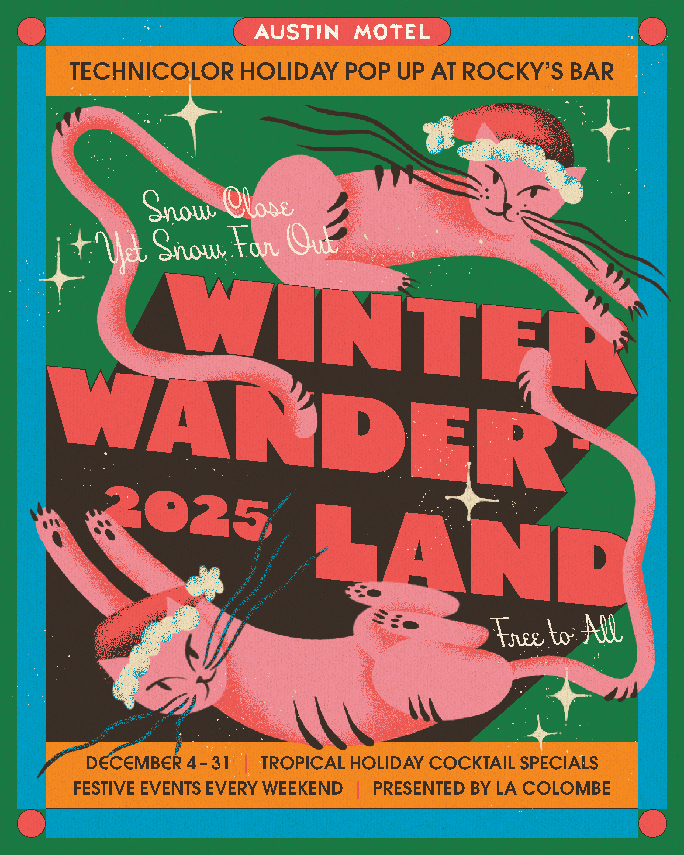 Have a jolly time taking in our technicolor holiday paradise with delightful yuletide fun, tasty holiday cocktails, and more rainbow-colored Christmas trees than you can shake a stick at. Visit us at Rocky’s Bar, wander amongst the trees, grab a festive drink (we recommend the shotskis), and take a seat in front of the fire at our delightful ski chalets. Experience Austin Motel’s Winter Wanderland, December 4 to December 31, with extra festive activities happening daily, Thursday through Sunday. Entry is free.