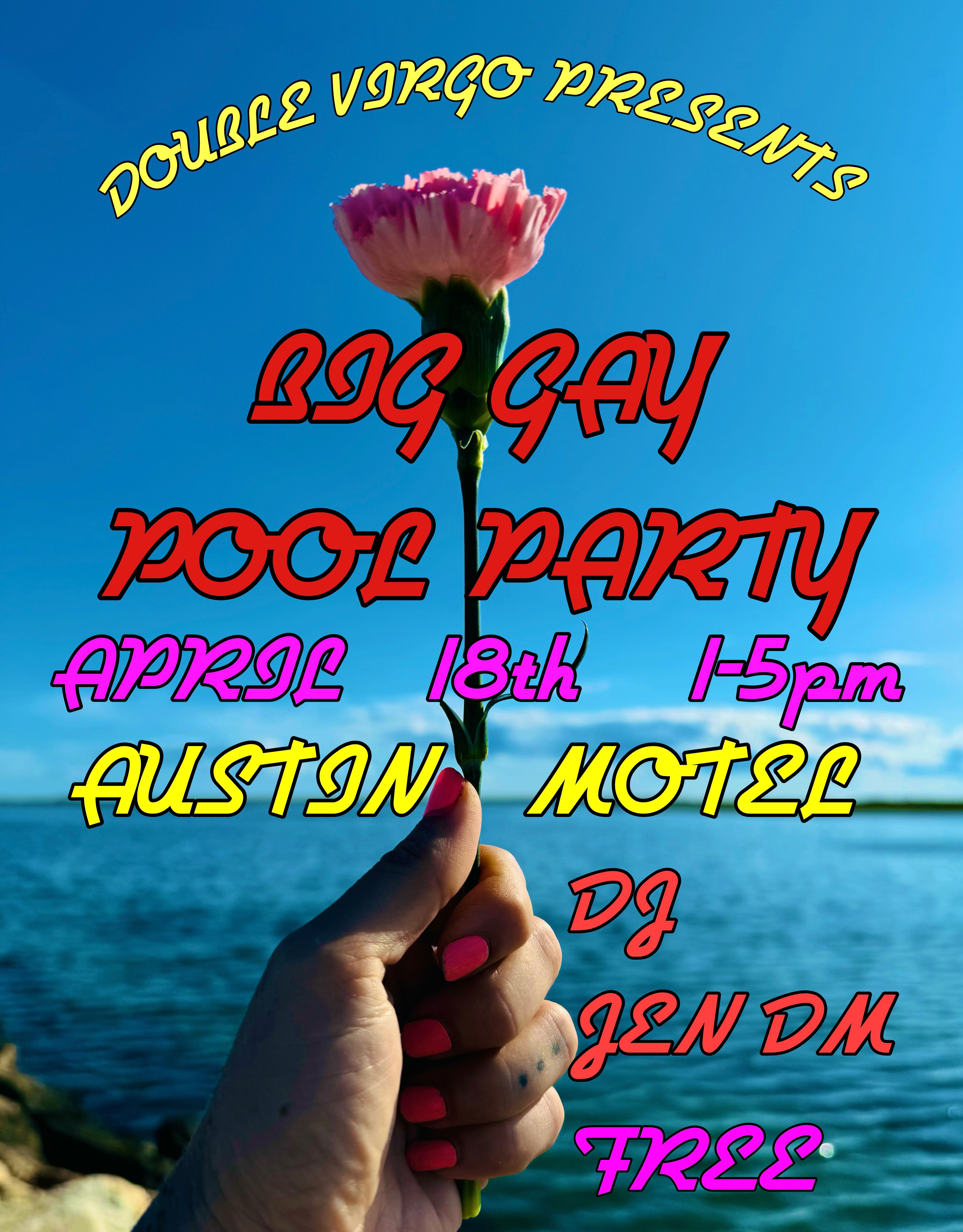 It’s officially swim season y’all, and we’re kicking things off with DOUBLE VIRGO to bring you a Big Gay Pool Party on Saturday, April 18 from 1 – 5 PM at our retro oasis on South Congress. With DJ Bethcita and DJ Jen DM on the decks, we see a dance-dunk-tan-swim spin cycle in the forecast all day long. Join the party—entry is free, sun will be high, and drinks will be cold.