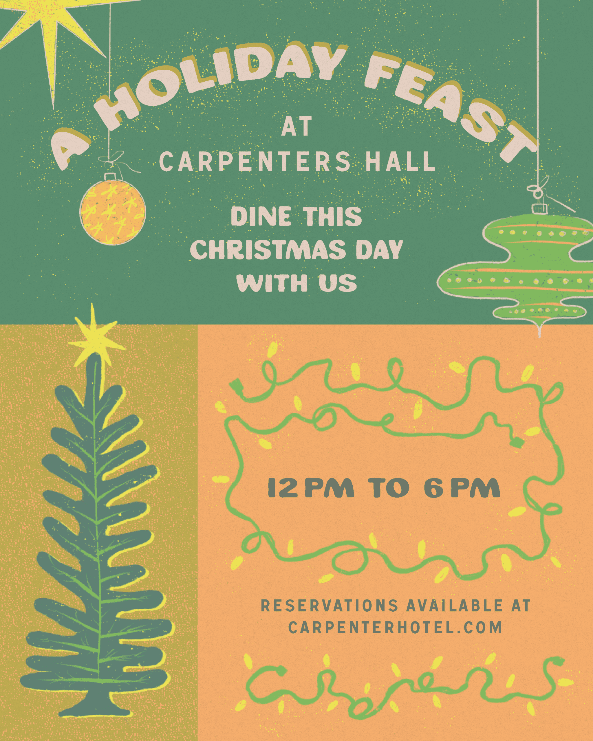 Gather with loved ones around our table at Carpenter’s Hall this season. We have ample opportunities for you to indulge on Christmas day.