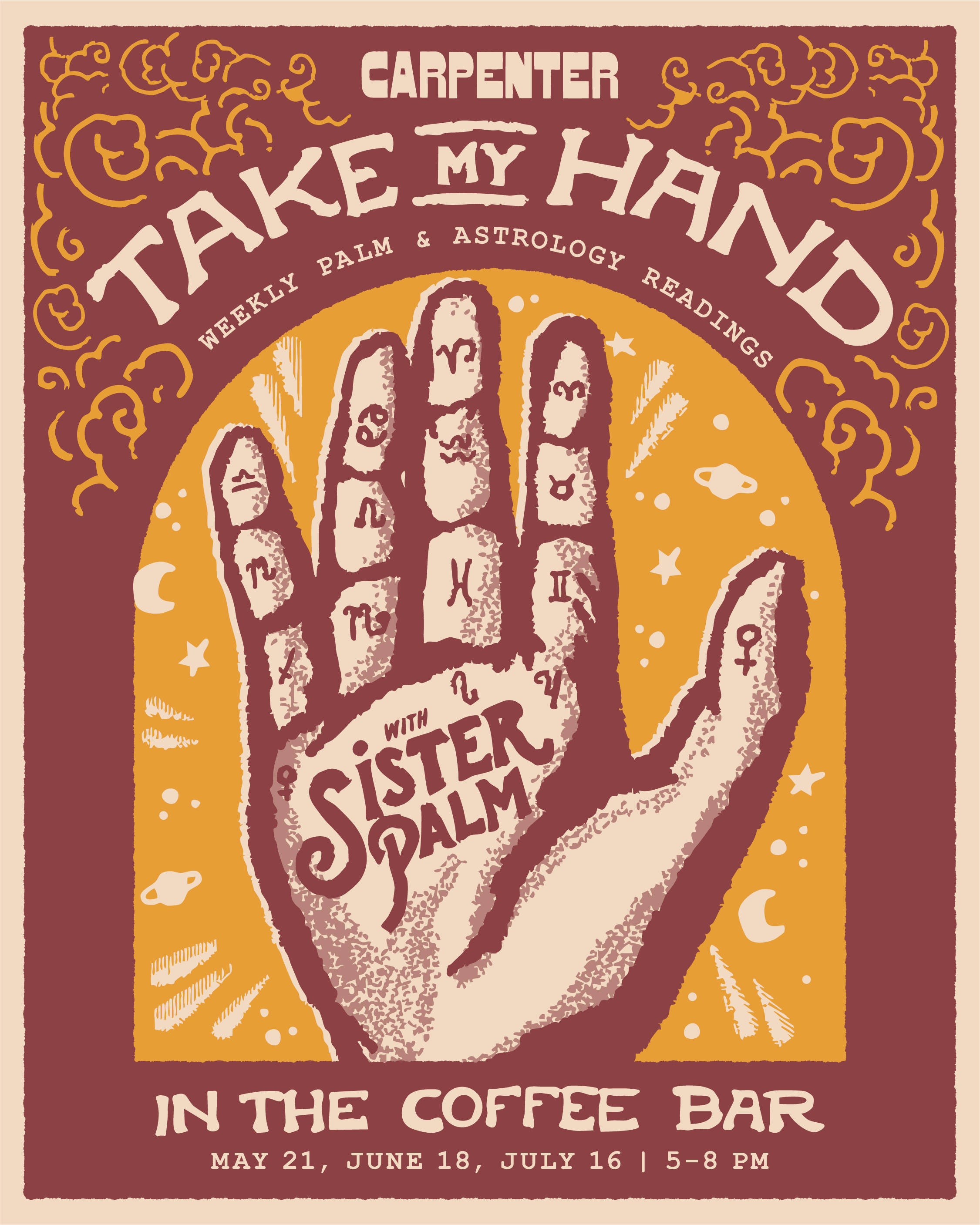 Palm + Astrology Readings With Sister Palm on dates this Summer from 5 – 8 PM. Walk up or reserve your spot ahead of time for a 15-min palm reading or an astrology reading with Sister Palm at Carpenter Coffee Bar.