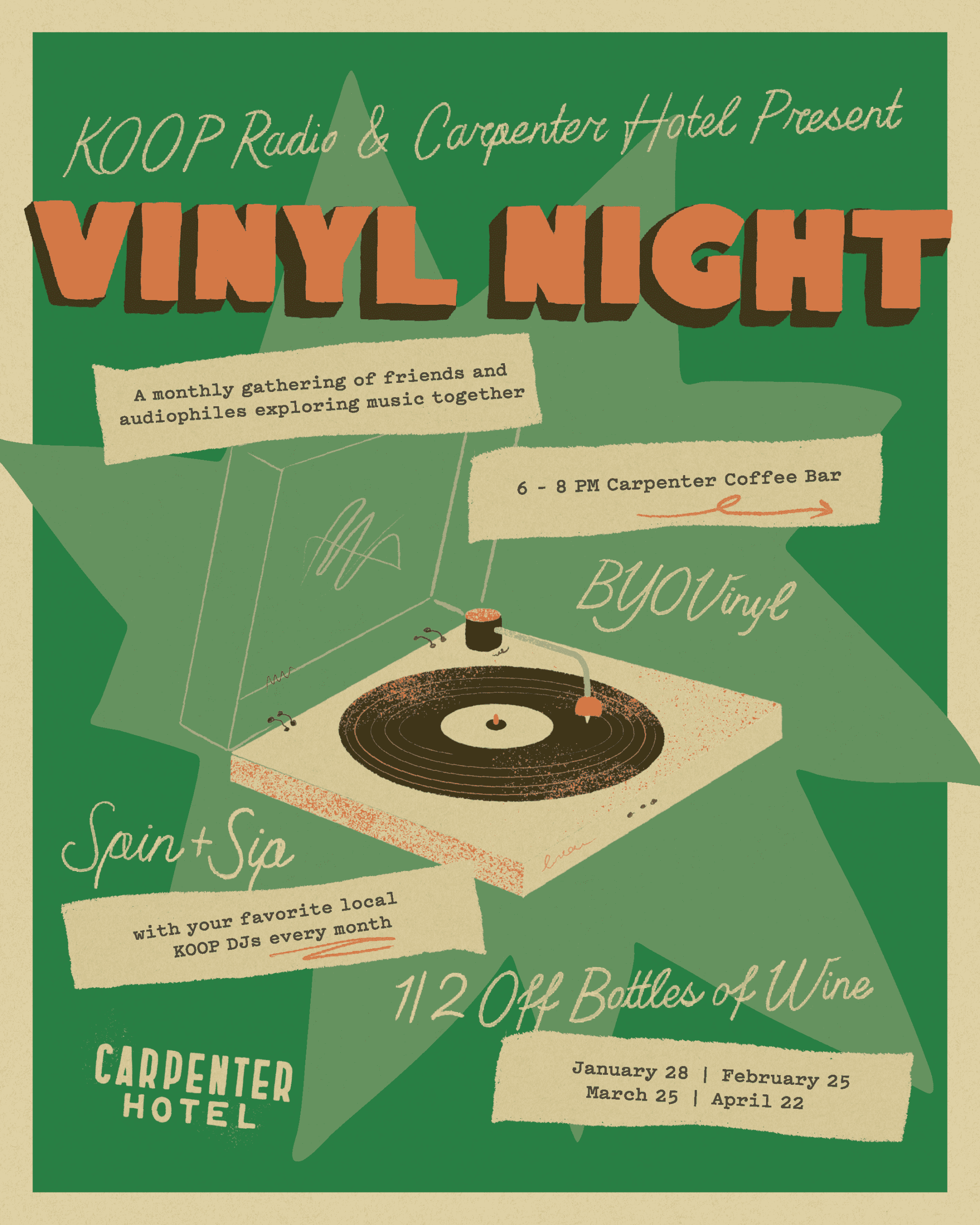 Spin + Sip with your favorite local KOOP Radio DJ’s monthly in Carpenter Coffee Bar. Bring your own vinyl to spin, or sit back and relax to the sounds of our hosts’ curated vinyl playlist. Even better: enjoy 1/2 off bottles of wine all night.