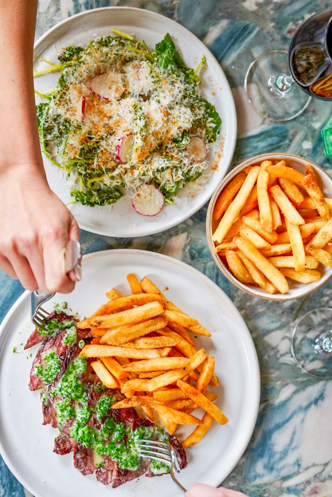 Enjoy Wednesday specials including $35 Steak Frites with bottomless fries, $5 Caesar salads, and 50% off select bottles of wine.