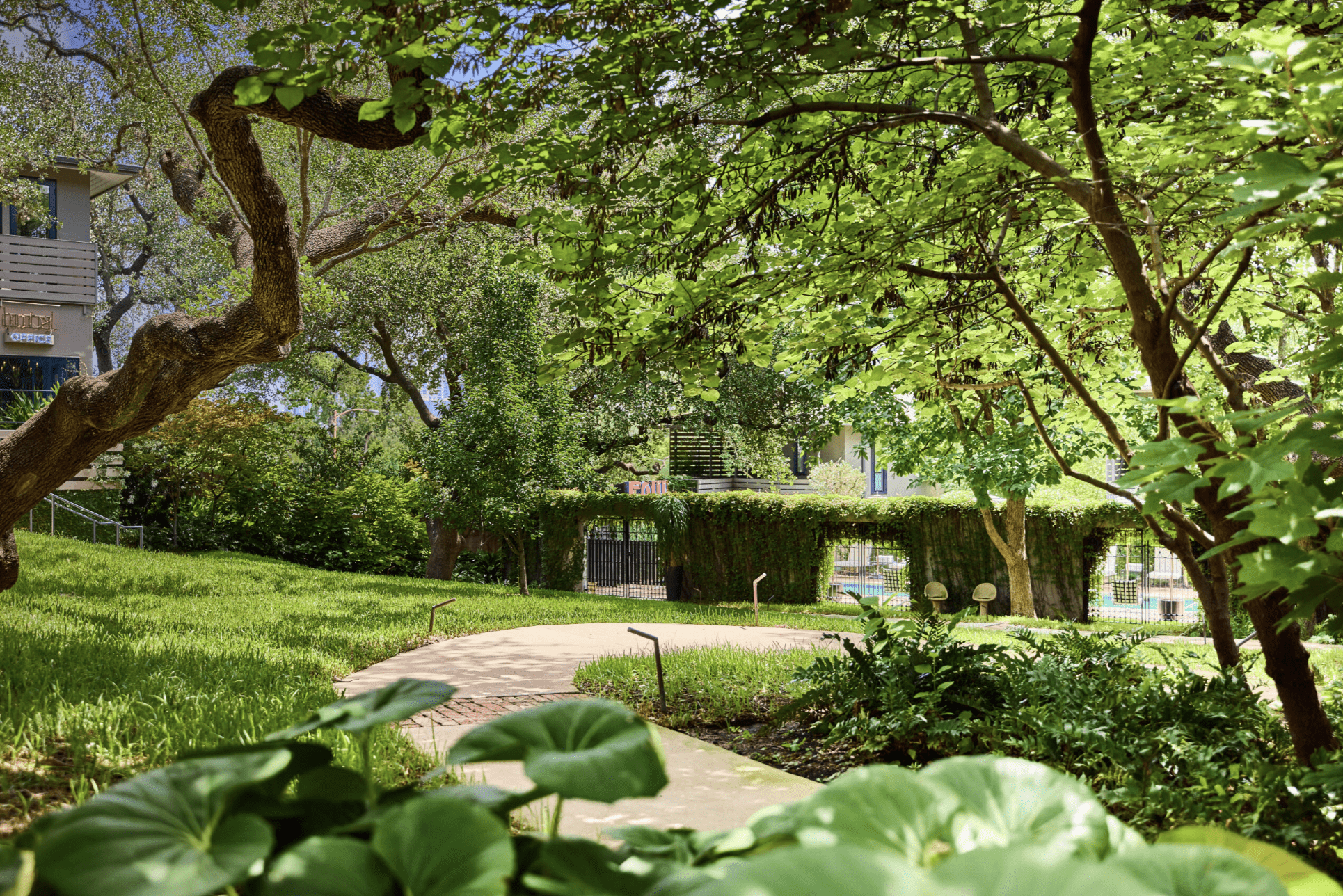 The lush grounds of Hotel Saint Cecilia are a secluded hideaway in the center of it all.