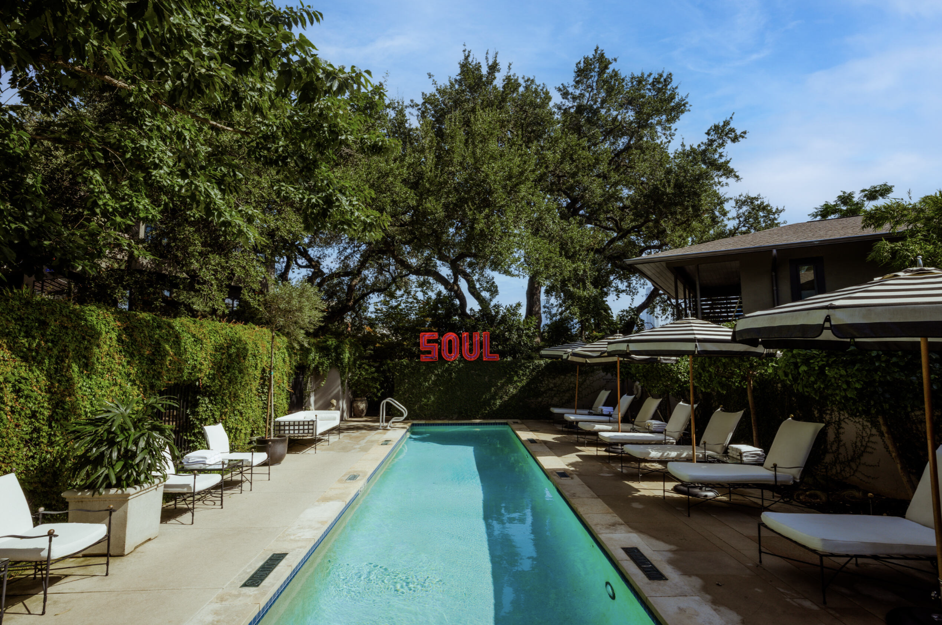 Built in 1888, the original Victorian home is anchored around the majestic oak tree located at the heart of the property. Fully restored with the addition of the iconic SOUL sign in 2009, the Hotel Saint Cecilia is a private sanctuary tucked away off South Congress.
