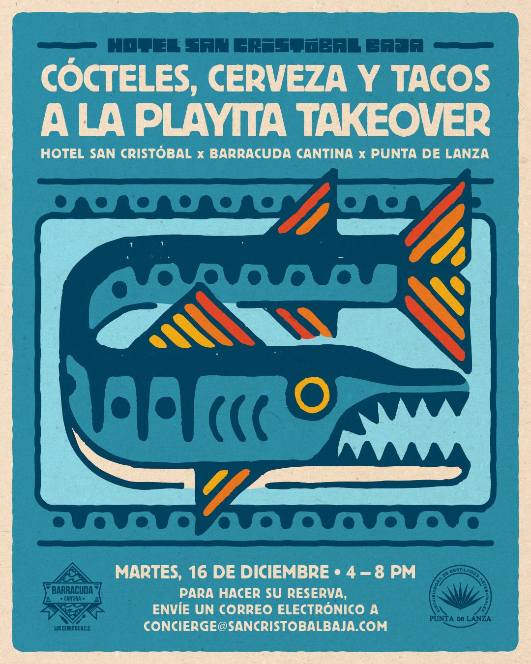 Acompáñenos en la playita para disfrutar de una velada especial con cócteles, cervezas y tacos especiales de nuestros amigos de Barracuda Cantina y Punta de Lanza. Disfrute de música en vivo, buena comida y una puesta de sol aún mejor.