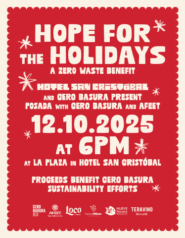 Join us for a festive evening and traditional Mexican Posada with Cero Basura! Enjoy a 3-course dinner with wine pairing by Chef Jorge Cuadros of Hotel San Cristóbal, entertainment by renowned Mexican opera singer Marcela Chacon, the joyful sounds of local favorite DJ Chachín, piñatas (with prizes inside), and the traditional re-enactment of “Pidiendo Posada” (Seeking Shelter).