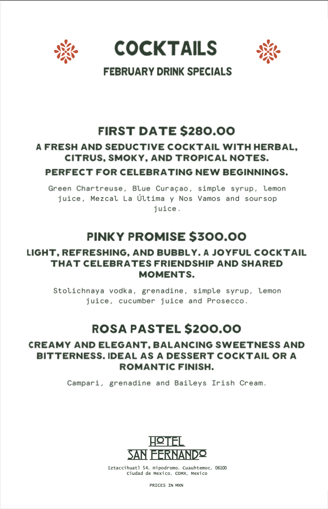 The Lounge at Hotel San Fernando makes for the perfect first or last stop of a storied evening. We invite you to linger over whatever you like. Sit for a coffee and email catch-up, meet up with friends and kick off the night with a classic Mexican cocktail, then let the evening evolve as you explore our selection of signature sips and a curated menu of cheese boards, tacos, and beyond.