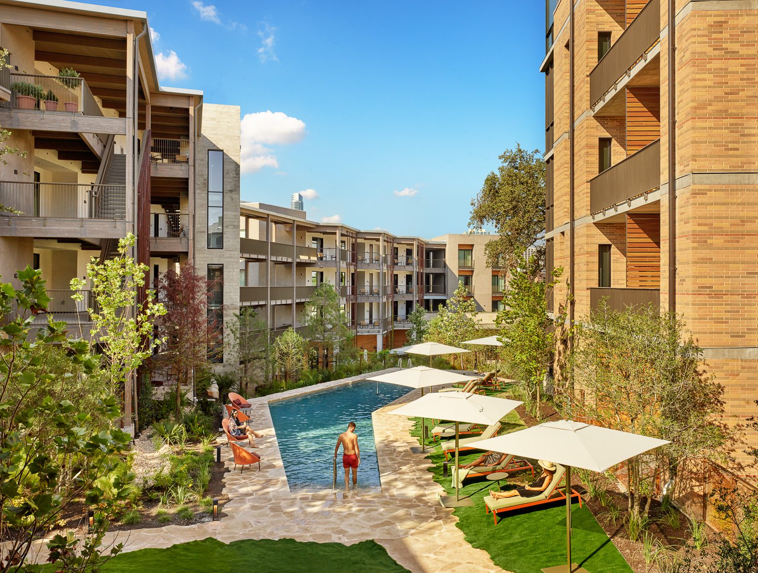 Discover paradise among the pecan trees: the Carpenter Hotel pool. Our guests-and-passholders only gem is the perfect spot to cool off, preferably while indulging in sips and snacks from Carpenters Hall.